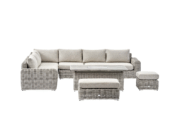 - Crafted from robust round all-weather wicker weaves and internal aluminium frames, the hard-wearing outdoor set comprises of a large corner sofa as well as a bench and footstool, providing plenty of seating space for those outdoor tea parties.