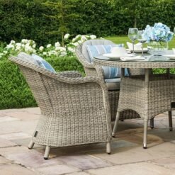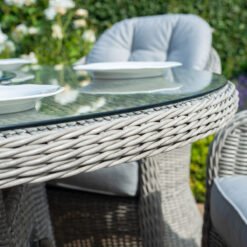 The Oxford 4 Seat Dining Set with Heritage Chairs brings a touch of luxury to your al fresco dining. The round table topped with toughened glass teamed with the four comfortable chairs complete with base and back cushions to make this the perfect set to share breakfast, lunch, or dinner!